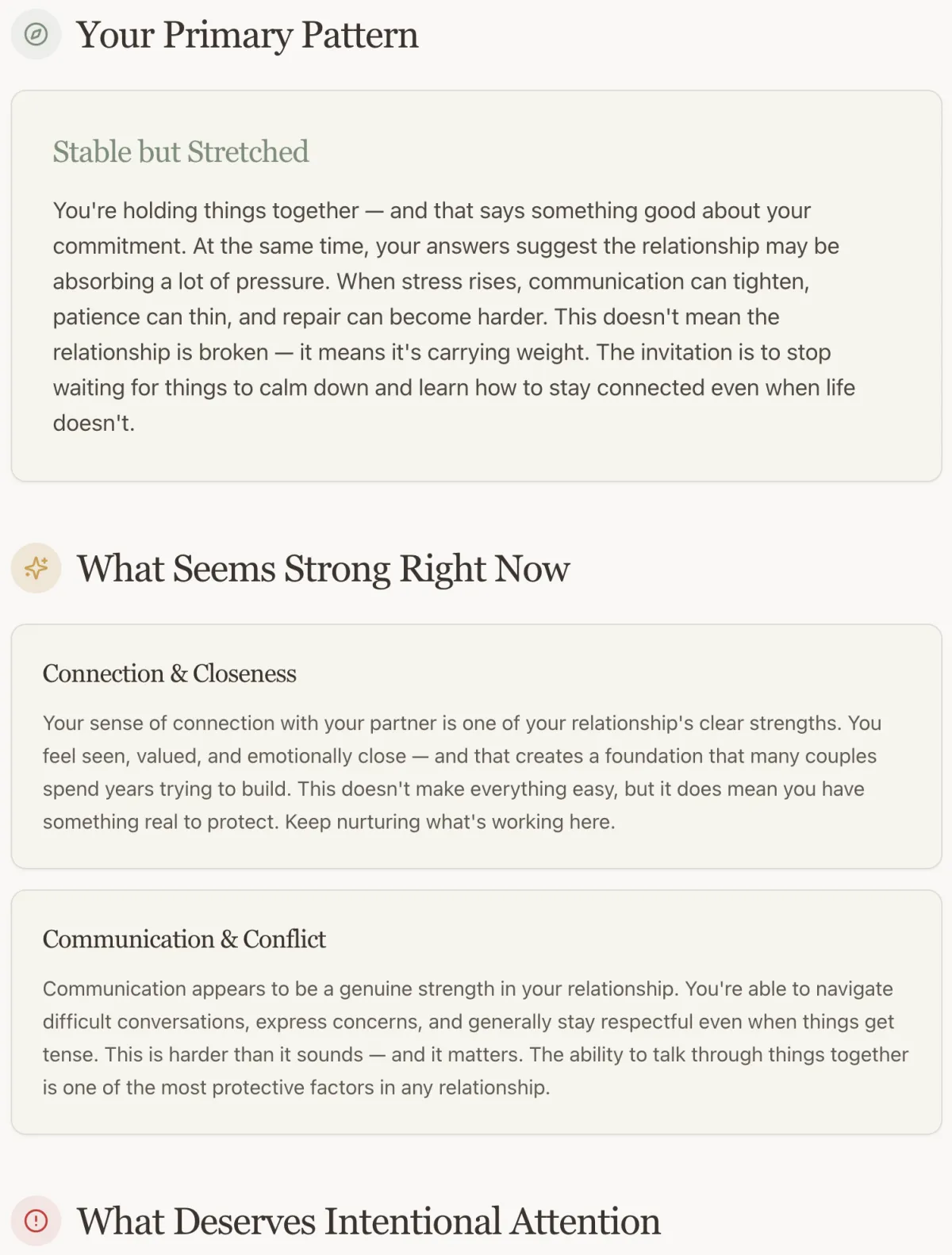 • A personalized PDF Relationship Health Report with guided discussion prompts